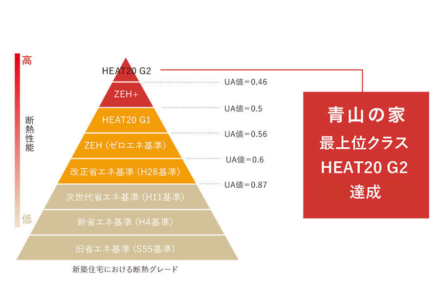 断熱最高等級G2を達成- 青山の家では最上位クラスであるHEAT20 G2の断熱性能を達成。断熱性能が高く、冬場に暖房の熱が逃げにくく、夏場は外の熱気が室内に伝わりづらいといった特徴があります。空調をガンガン効かさなくても快適に過ごすことができ、結露が発生しづらくなります。結露が発生しにくい住宅は単にメンテナンスが楽になるだけではなく、カビ・ダニを防止でき、健康面のメリットがあります。